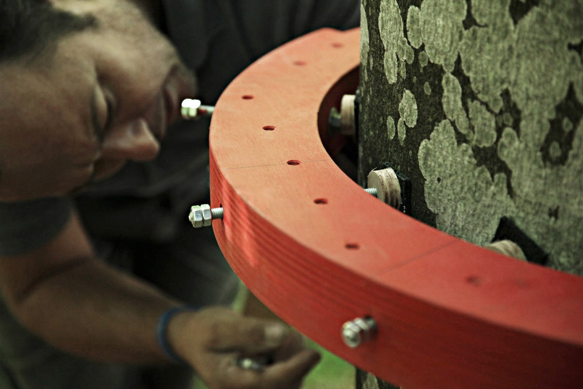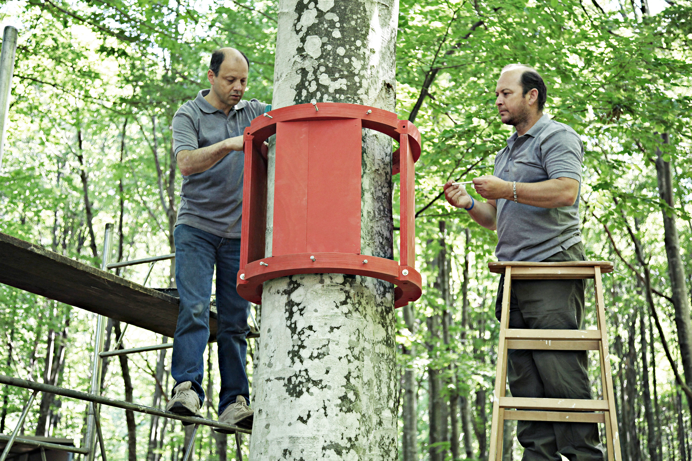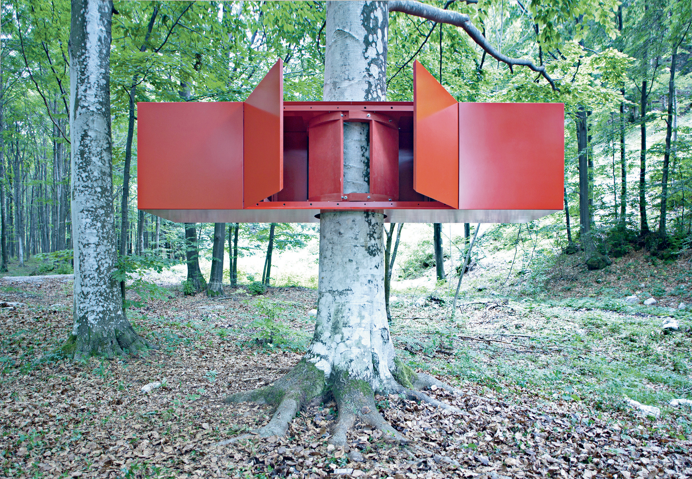 La scultura rossa tra le fronde dei faggi è visibile da parecchi metri di distanza: alcuni curiosi si avvicinano per capire di che cosa si tratta e anche loro vengono rapiti dall’incantesimo.