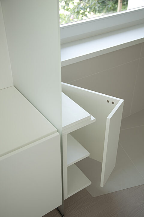 A moltiplicare l’intensità della luce intervengono le superfici bianche delle pareti e degli arredi su misura nonché le superfici rivestite a specchio che arricchiscono gli spazi di nuovi giochi di luce e riflessioni.
