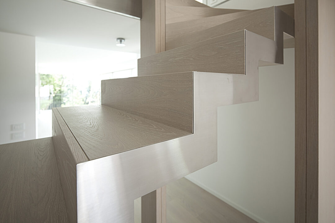 Studiata come oggetto libero nello spazio, la scala a giorno è realizzata nella medesima essenza del pavimento, in rovere sbiancato, e vede sottolineata la sua geometria da un rivestimento in inox, materiale contemporaneo ed elegante che caratterizza molti dettagli.