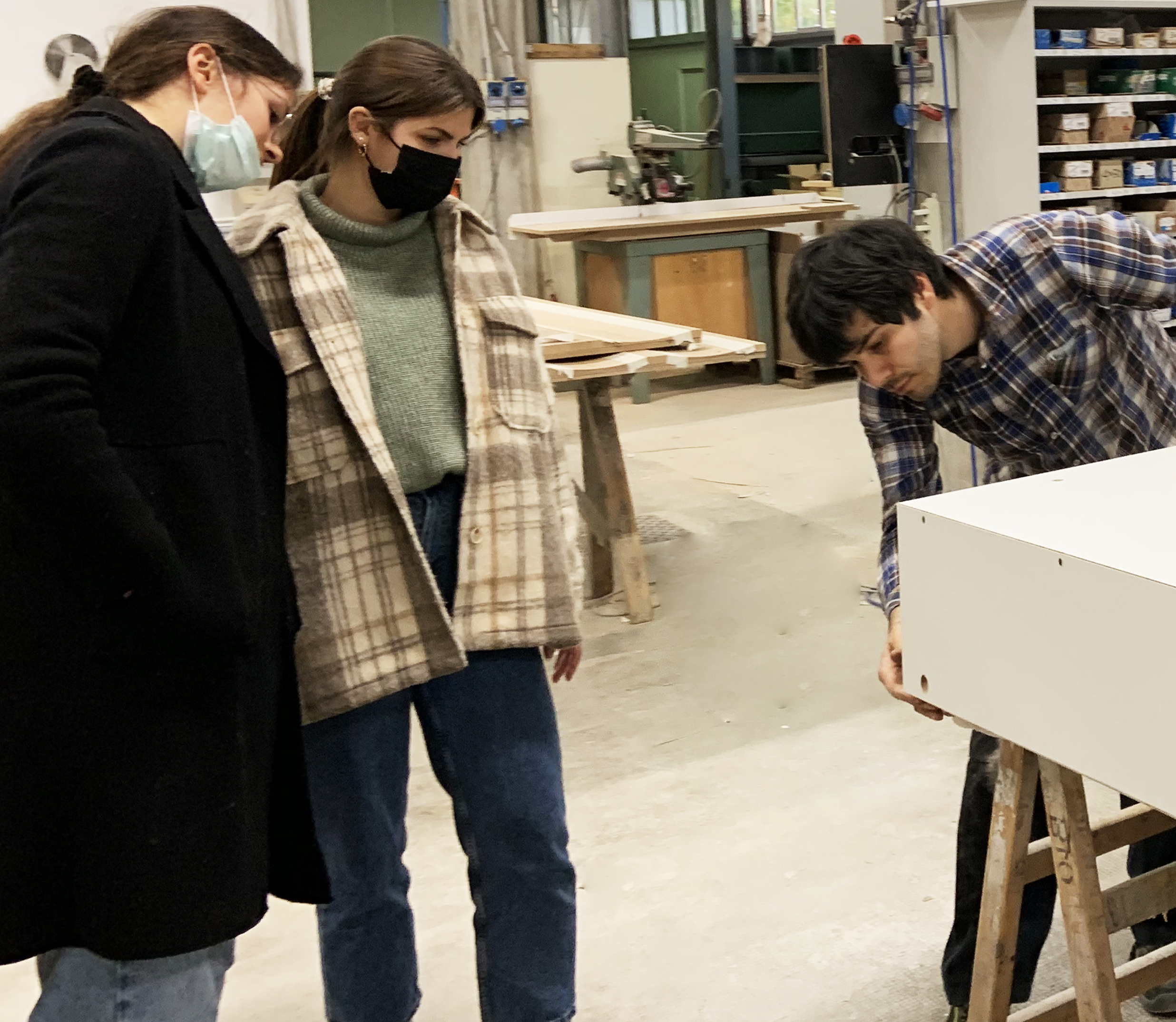 Una parte importante del progetto è la partecipazione dei vincitori del concorso alla realizzazione del mobile. In questo modo i giovani studenti hanno modo di avvicinarsi al mondo della produzione e conoscerne la varie fasi. Partendo dall’ufficio tecnico le due giovani Karolina Pavlič e Katja Novak hanno seguito il processo che trasforma il loro mobile “MAgic Box” in un oggetto di design: studio delle soluzioni tecniche più adeguate, scelta dei materiali e ingegnerizzazione dei disegni tecnici.